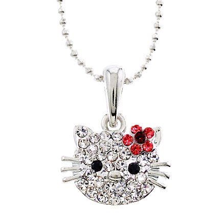 Worn by many celebrities including Paris Hilton this irresistible Hello Kitty pendant sparkles with brilliant Austrian crystals. Black crystals form the eyes and the vivid red flower adds a flash of color. Includes a rhodium plated bead chain. Read more...