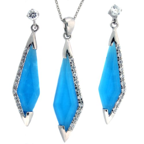Aquamarine Blue Crystal March Birthstone Sterling Silver Necklace and Matching Earring Set. Sparkle, Dazzle, Sophisticated. The Aquamarine crystal is rich blue-green color and represents mental peace and clarity, by providing emotional and mental balance. Some say to wear aquamarine brings love and affection. To give aquamarine is to offer the gift of knowledge, foresight and individual inspiration. This stunning necklace pendent features a handmade blue crystal set in .925 sterling silver with CZ diamonds and matching dangle post back earrings. The silver is rhodium plated and is tarnish free. Necklace measures: 18" and Dangle Earring Measures: 1.75" Length. The set come complete in a Bucasi gift box. Exclusively from Bucasi. A Gift That She Will Remember! Read more...