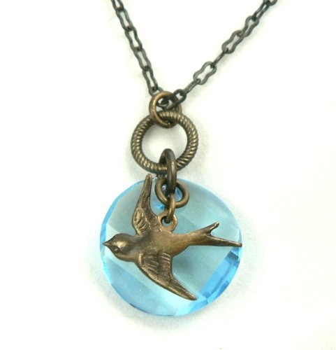 Celebrate our fine feathered friends by sporting a sweet sparrow necklace. Bird charm swings free against the sky blue crystal background. Pendant length is approximately 1.2 inches (31mm). Natural brass components, chain, hook clasp are nickel-safe. Genuine Swarovski crystal twisted disk pendant in gorgeous sky blue provides background for the swooping sparrow. Read more...