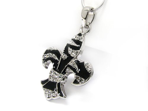 Here is a beautiful white gold plated crystal and black enamel fleur de lis pendant necklace. This necklace is great for any occasion! The pendant measures approximately 1 1/4" wide and 1 3/4" long and hangs on a 16" long silver snake chain. Your necklace will come to you in a foil gift box perfect for gift giving. Box may be a different color than the one shown. Read more...