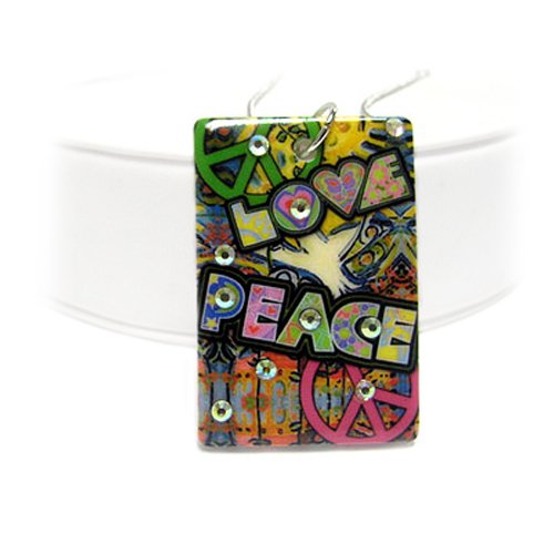 Here is a fun crystal studded acrylic peace tattoo picture pendant necklace. This colorful rectangle pendant measures approximately 1 1/4" wide and 1 3/4" long. It has the words "LOVE" and "PEACE" written on it, and is accented with small clear crystals. This is just the piece of jewerly you need to brighten your look! Comes on a 16" silver snake chain that can be extended. This necklace will come to you in a foil gift box perfect for gift giving. Box may be a different color than shown. Read more...