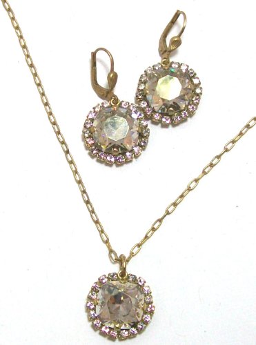 Set of necklace and matching earrings with Beautiful round shade Swarovski crystal surrounded by smaller shade crystals. Great neutral color to go with everything. Also available in Caribbean Blue, pacific opal, champagne. Designed by Catherine Popesco for La Vie Parisienne. Read more...