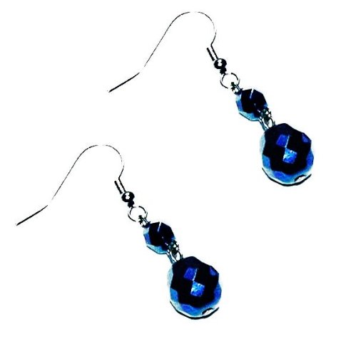 1 Inch Dangle Earrings made with Dark Blue and Green Iridescent Czech Glass and crystals. The sophisticated hues of the crystal and glass perfectly complement each other, causing beautiful reflection and sparkle. The 1 inch drop allows for movement and visual interest. Your earrings will be shipped to you in a bow tie box appropriate for gift giving. Read more...