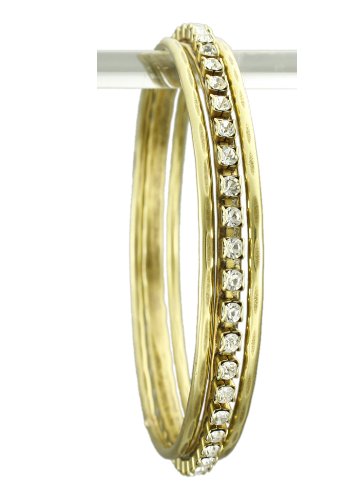 Two intricately hammered thin bangles frame one bangle set with Swarovki crystals. All in gold tone. This set is versital enough to be worn day to evening. Read more...