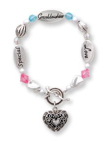 Enjoy the beauty of this silver-plated and crystal Expressively Yours bracelet. The Special, Granddaughter and Love words are on both sides of the silver bead. It is finished off with a heart charm and a toggle clasp. Included with this bracelet is this inspirational saying: Granddaughter you are special it's true, Touching my heart with all that you do, You grow dearer with each passing day, Sharing your love along the way. The bracelet measures 8 inches. It comes packaged in a beautiful gift box with a ribbon-ready to give as a gift. Read more...