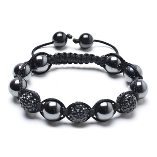 Feel the power of a black bracelet inspired by Shamballa Jewels. This shining crystal and gemstone bracelet emits energy with its hematite gemstone beads and instensely dark color. Shamballa inspired bracelets are a key accessory for jewelry wearer who wants to be on trend. Alternating sparkly disco ball beads and shiny hematite spheres are tied on a black nylon cord and macramed for ultimaate security. An adjustable sliding clasp makes this unisex style jewelry ideal for putting it on with ease. Never ask your partner or roommate to clasp your jewelry for you ever again. These versatile bracelets look great stacked together so buy a few at this affordable price. Inspired by Shamballa Jewels designs derive their inspiration from the original jewelry designs of Mads Kornerup, who founded Shamballa Jewels ApS, which owns the trademark Shamballa. For more information go to the authentic Shamballa Jewels products. Read more...